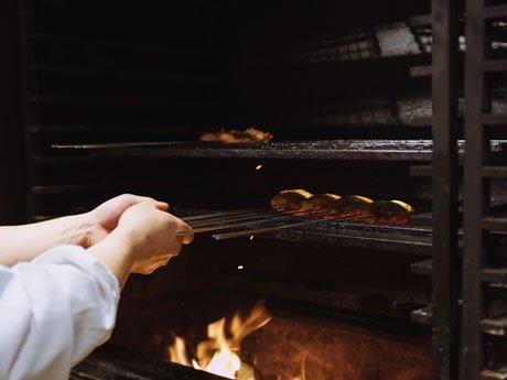 Wood-fired cooking infuses a delightful aroma into the meat, but the moisture in the wood makes it difficult to achieve crispy skin while leaving the inside moist and tender. Suetomi and Head Chef Hikita Toyoki have used their experiences working with wood fires to find ways around these difficulties.