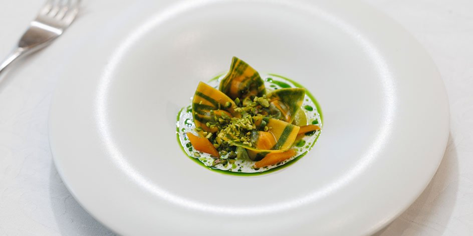 Chef Takuaki Hamamoto honed his craft at several renowned restaurants across Italy, from north to south, before gaining further experience in Singapore. Today, he brings that breadth of expertise to Tokyo. His cooking is defined by thoughtful pairings and a restrained, simple approach that draws out each ingredient’s natural flavor to its fullest. One standout dish, the “Pumpkin and Pistachio Ravioli,” showcases seasonal vegetables delivered from Japanese farms alongside Sicilian pistachios, brought together through his distinctive technique—an elegant expression of FARO’s culinary philosophy.[