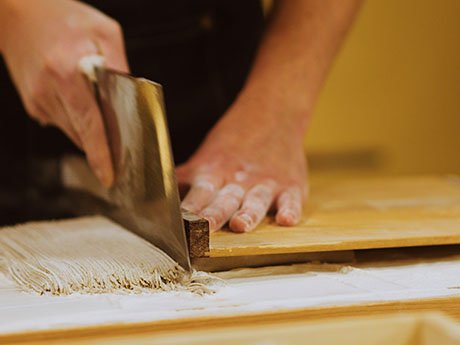 For this reason, many soba restaurants will use only 50% buckwheat flour for their blend, with the remaining half being wheat flour. Many high-end restaurants still only use 80% buckwheat. This mixture helps the noodles keep their shape, but the final product loses the pure buckwheat flavor and aroma. Soba Osame's owner, Osame Kenji, experimented with different cooking methods to find a technique that would give 100% buckwheat noodles the best texture.