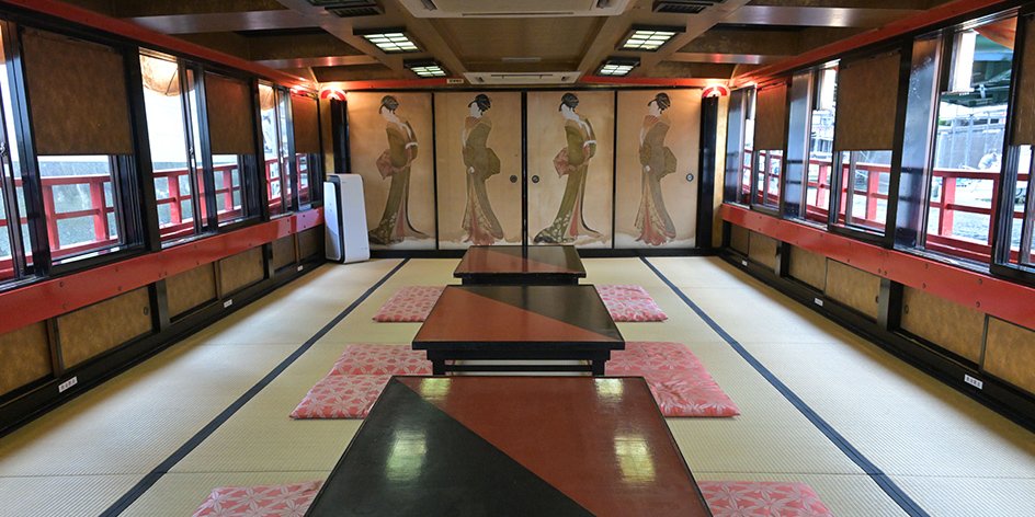 Part of the appeal of the Yakatabune lies in their exquisite craftsmanship—a piece of traditional Japanese architecture transported onto the river. From vibrant vermilion-lacquered hulls to weathered wooden classics, the variety of boats is stunning. Inside, the artistry continues with tatami floors, shoji screens, and fusuma sliding doors adorned with brilliant Ukiyo-e paintings, offering a complete immersion into the Japanese aesthetic.
