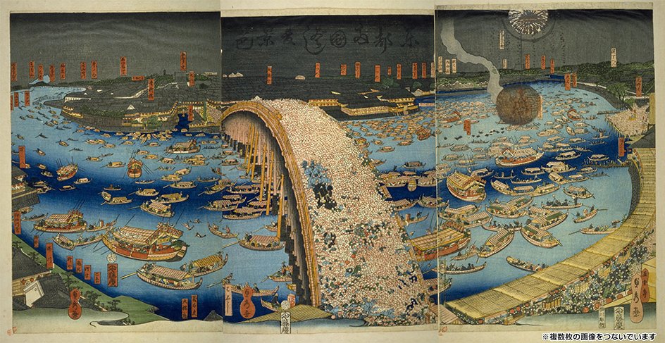 Utagawa (Gountei) Sadahide, "Panoramic View of Ryōgoku Bridge in the Summer," National Diet Library Digital Collections.Countless Yakatabune crowded the Sumida River in the Edo period.