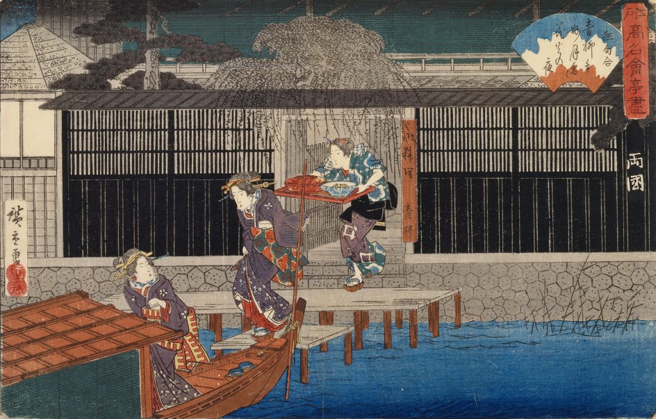 Utagawa Hiroshige, "Ryōgoku," from the series Famous Restaurants of Edo, National Diet Library. Delivering dishes from riverside restaurants to the Yakatabune.