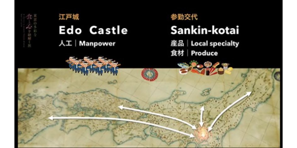 The building of Edo Castle, one of the largest wooden structures of its time, brought craftsmen and workers from all over Japan to the city. Additionally, under the sankin-kotai system—where feudal lords from across Japan gathered in Edo on alternating years—these lords regularly traveled to the city, bringing with them a variety of local products and ingredients.