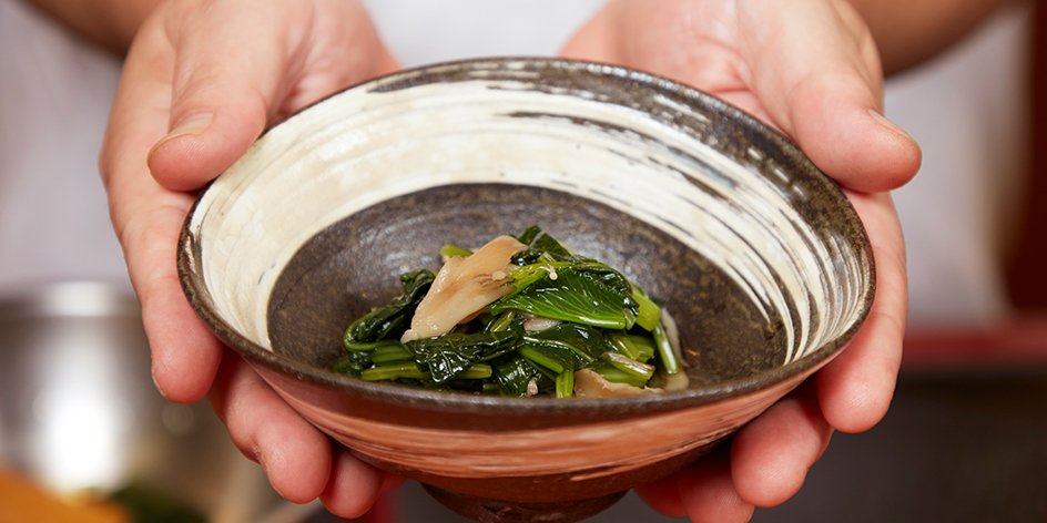 A signature Nihonbashi Yukari dish: "Komatsuna no hitashi" -boiled seasoned goseki bansei komatsuna (Japanese mustard spinach) from Edogawa with dashi broth and other vegetables.