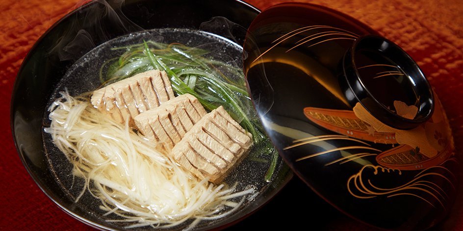 Owan (clear soup served in a lacquer bowl) with maguro (tuna) and two-colored Senju negi leek