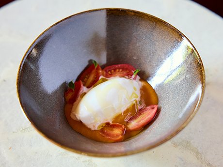 The second dish is “Local Goat Cheese and Tomato.” A scoop of smooth, fresh goat cheese ice cream is placed on ratatouille, complemented by tomatoes treated in three ways: semi-dried, smoked, and fresh.