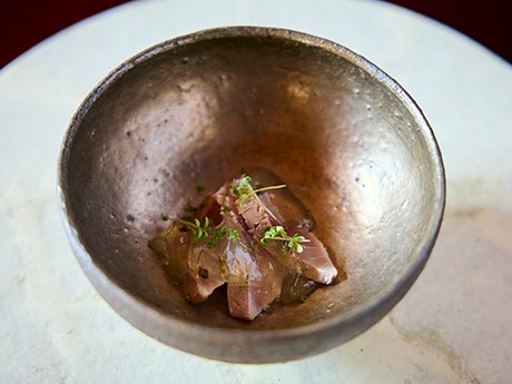 The restaurant uses Mackerel Scad sourced from Hachijo Island and first wraps it in kombu, infusing it with umami (the fifth basic taste discovered in Japan), before searing it over a rice straw fire. This smoky fish is artfully placed over a unique Japanese-Peruvian sauce, a reimagined Leche de Tigre.
