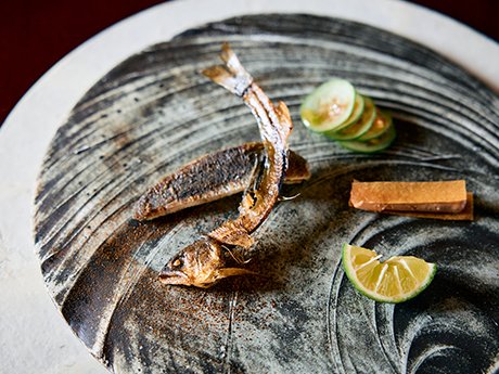 The fourth dish is “Akigawa Ayu Ichiyaboshi” (overnight-dried sweetfish). The ayu, Japan's representative freshwater fish, is a product of the clear Akigawa River, which runs through Akiruno City, L'Arbre’s location.