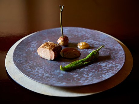 The dish offers the pork cooked in two ways and is accompanied by smooth Japanese scallion bulbs (rakkyo) simmered in chicken bouillon, and grilled Manganji chili peppers.