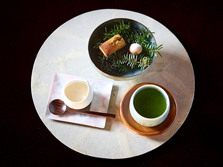 The final plate is a selection of petit fours. The custard pudding uses Tokyo-sourced milk, local free-range eggs, and vanilla beans from the Ogasawara Islands. The financier is flavored with Tokyo Sayama-cha, a rich Japanese tea grown in northwestern Tokyo. The snowball cookies are infused with kuromoji, kinako (roasted soybean powder), and orange.
