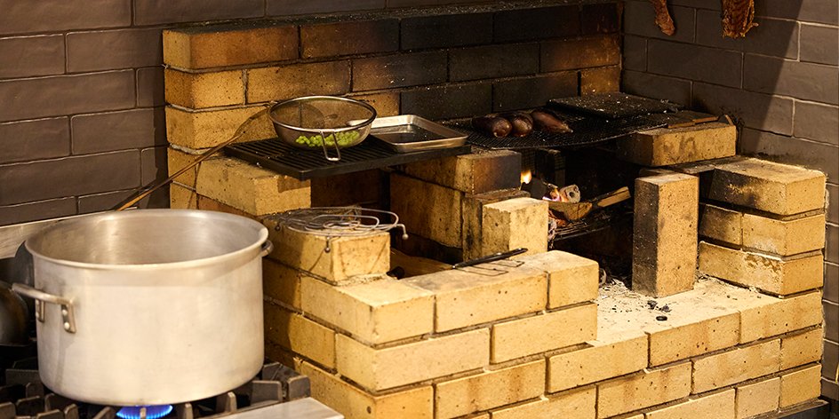 In L'Arbre's kitchen, a brick kamado (traditional stove) stands beside the conventional gas stove. Cooking ingredients with wood, rice straw, and charcoal adds unique flavors.