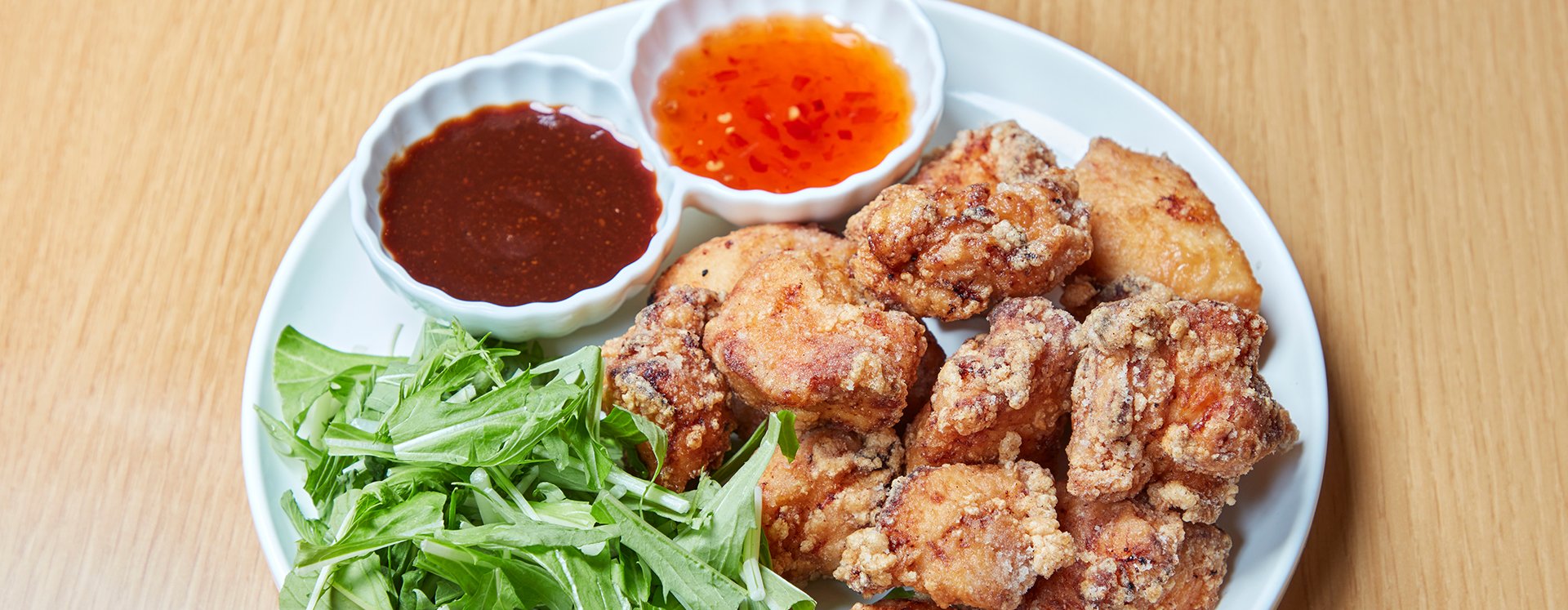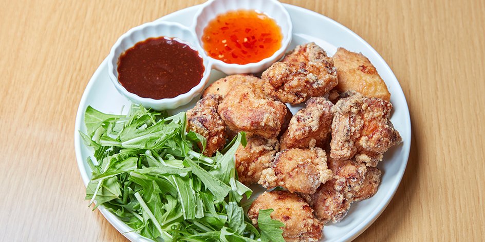 Karaage is a dish where ingredients are lightly coated in flour and then deep-fried in oil. In Japan, chicken is typically used, but other ingredients such as seafood and vegetables are common alternatives.