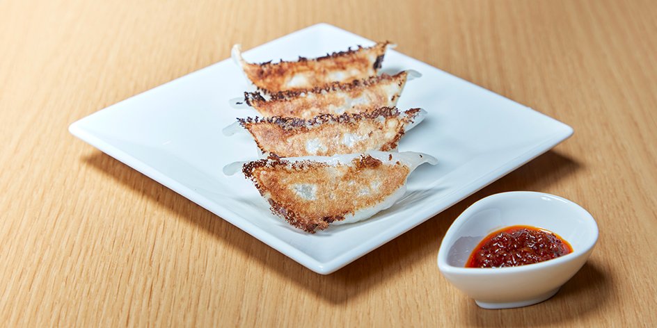 Gluten-free gyoza with a pleasantly chewy and moist texture.