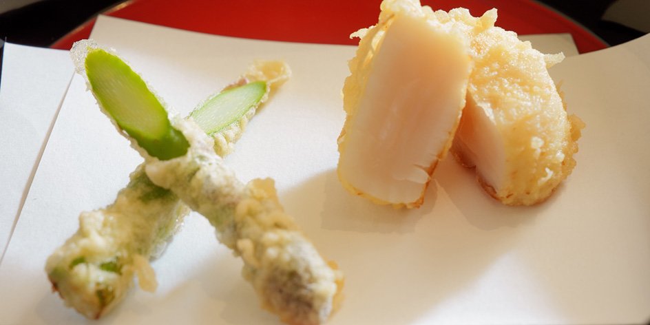 When scallops are freshly fried, the center remains delicately rare. The selection of vegetable tempura changes with the seasons, showcasing the freshest produce of the moment.