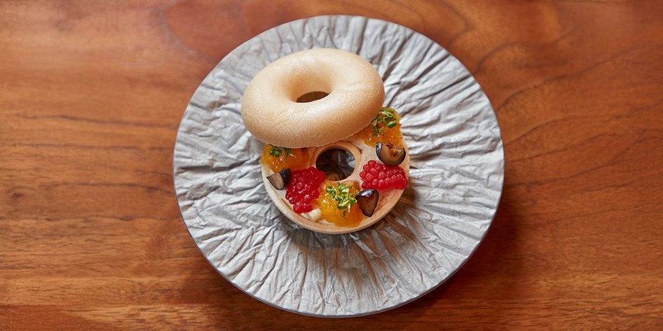 The rest of Akiyama’s menu showcases the same painstaking attention to detail. His donut-shaped monaka—a crisp wafer treat that could easily be mistaken for a dessert—features a tofu base and a filling of plump blueberries, raspberries, and kumquat jam nestled between two delicate disks. His ten-vegetable terrine, meanwhile, is a vibrant, multi-layered creation accompanied by elegant spirals of thinly sliced yellow and green zucchini and finished with dabs of a creamy, subtly smoky purée.