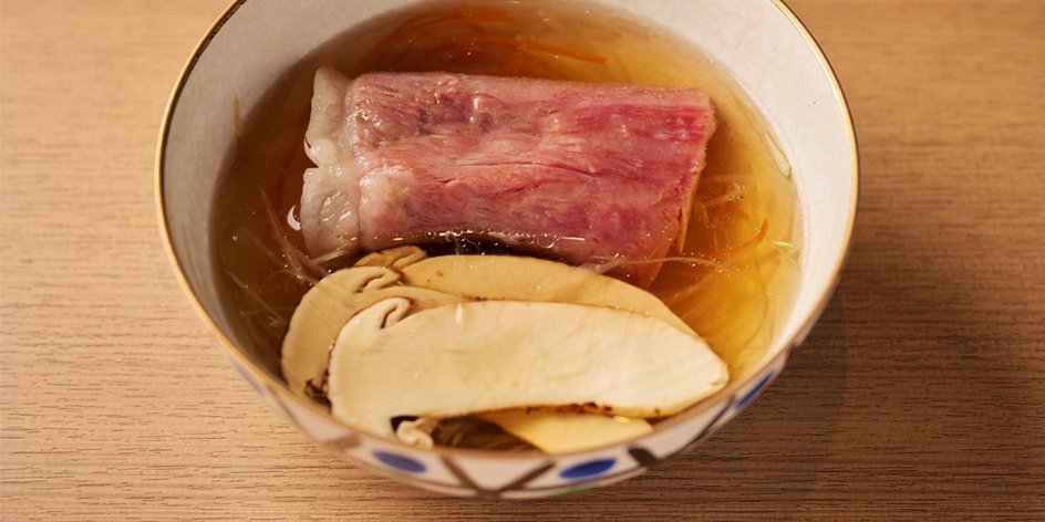 Matsusaka beef sirloin with matsutake mushrooms in sawani-wan style combines the Japanese sawani-wan clear broth dish—abundant with meat and vegetables—with yakiniku.